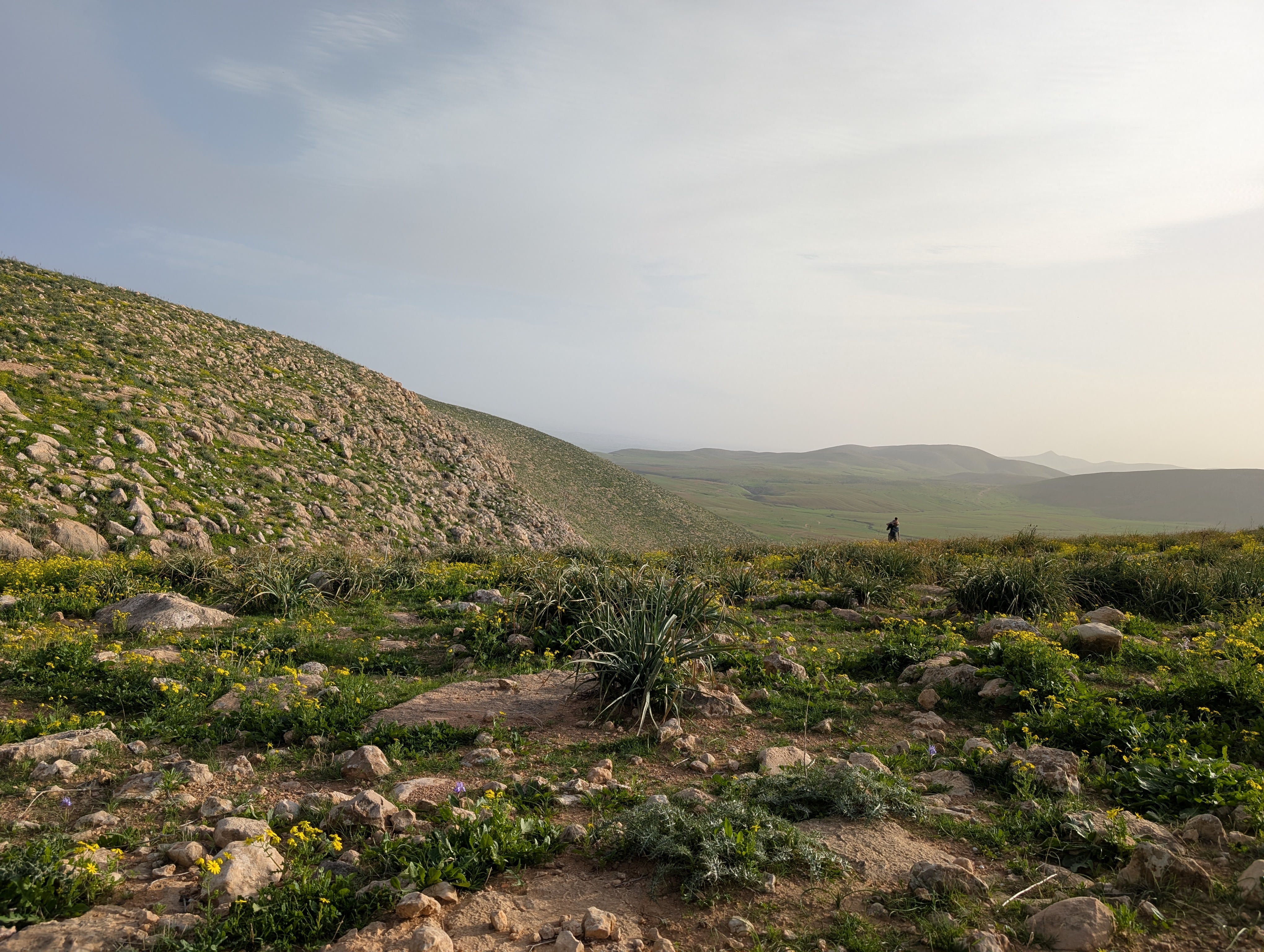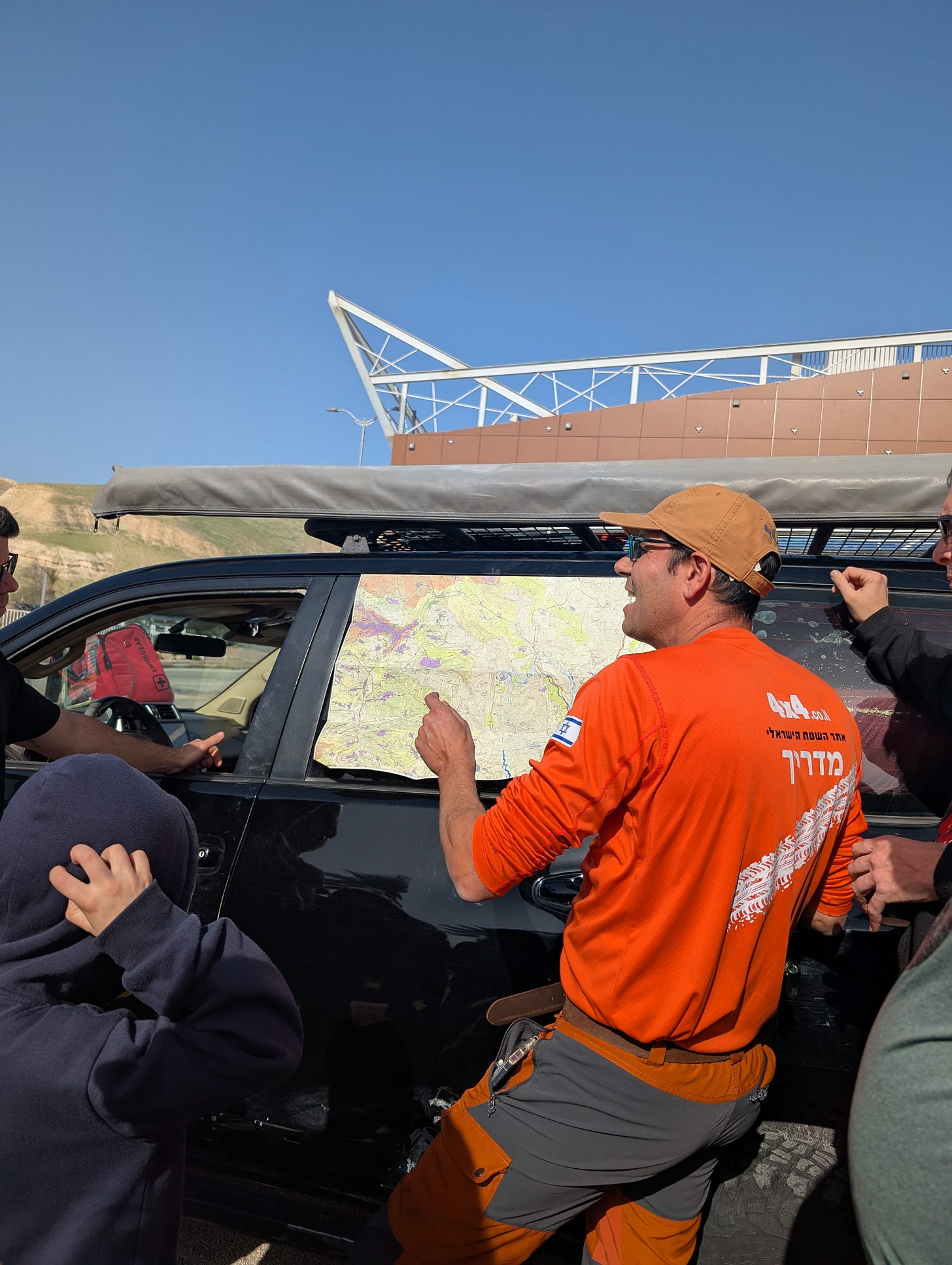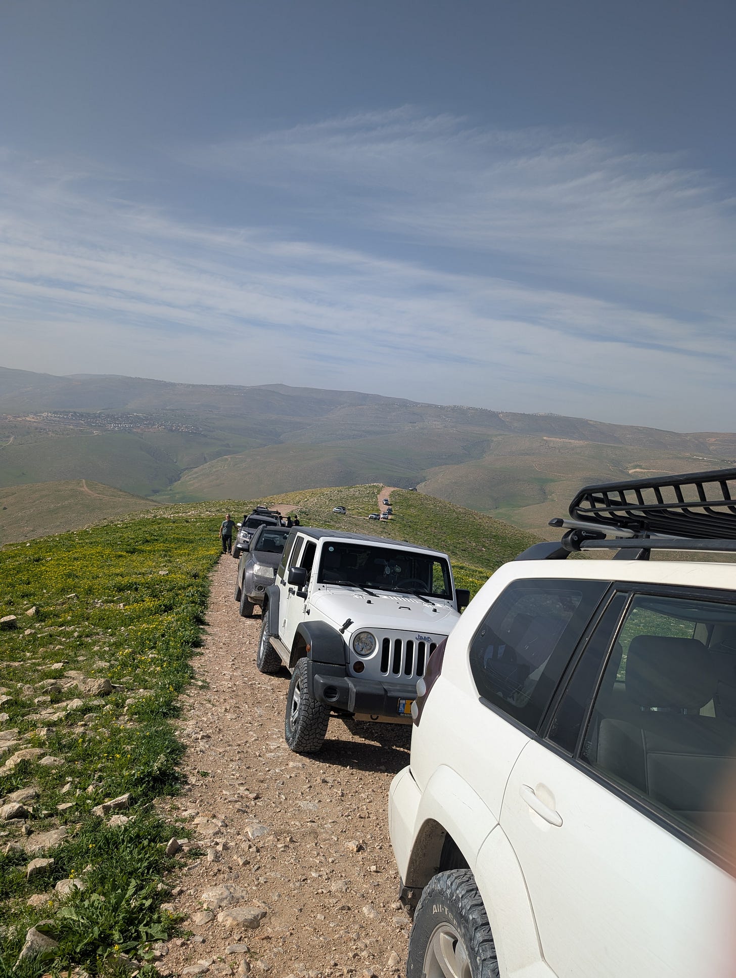 Our guide showed us the route on his map. He described the technical challenge of the road as “not hard,” meaning no jeep was at risk of falling off a sheer rock face and there would be no sections that involved jeeps making four attempts before passing narrow and rocky terrain. This, we hoped. We’ve done the Negev and the Dead Sea section of the Judean Desert. This gravelly path through flowers and fields looked more welcoming than other routes we’ve taken. But hey, we were here for the challenge too.